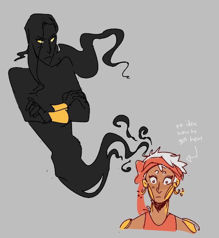 - all other forms he takes are the result of his snake body "dissolving" into a smoke-like substance that can become different shapes (this is my djinn-flavored interpretation of the spectral glamour power). complexity and solidity of the projection depends on power level and also his mood but he can speak to anyone this way. generally a bit like this (feat. kalim):